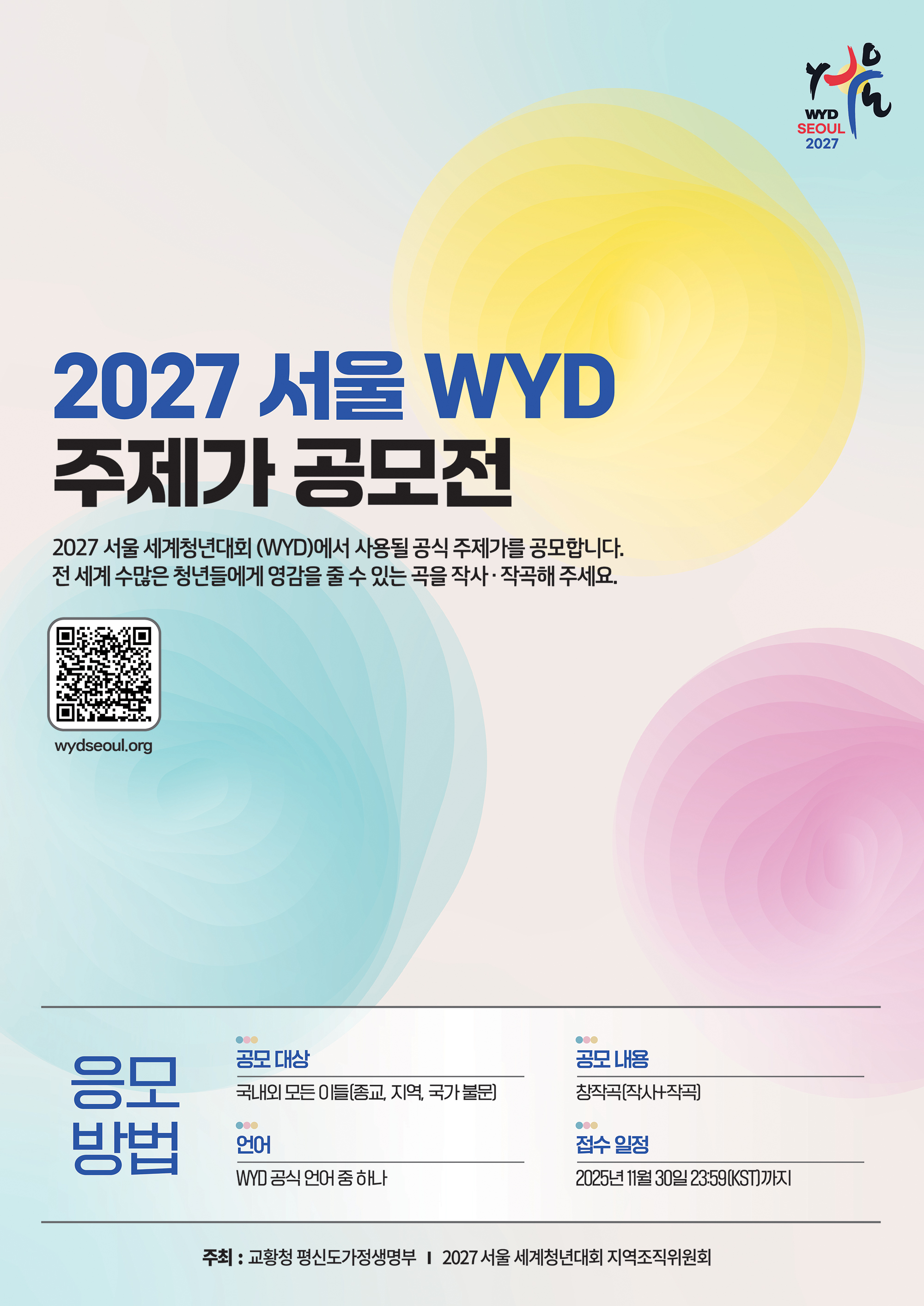 △ 2027 서울 WYD 주제가 공모전 포스터 2027 서울 세계청년대회(World Youth Day, 이하 WYD) 지역조직위원회는 교황청 평신도가정생명부와 함께 ‘2027 서울 WYD 주제가 공모전’을 ...