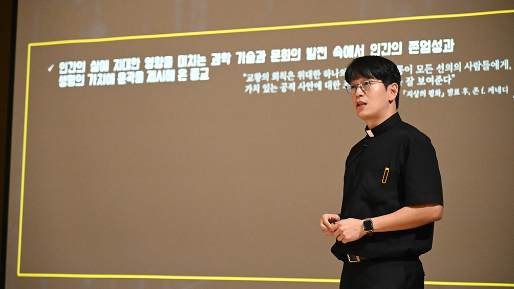 가톨릭대학교 신학대학 윤리신학 교수인 방종우 신부가 ‘WYD 수퍼클래스’에서 ‘기술 앞에 선 신앙인-AI 시대, 그리스도인의 감수성’를 주제로 강의하고 있다.“졸업을 앞둔 미대생입니다. 그림 공부를...