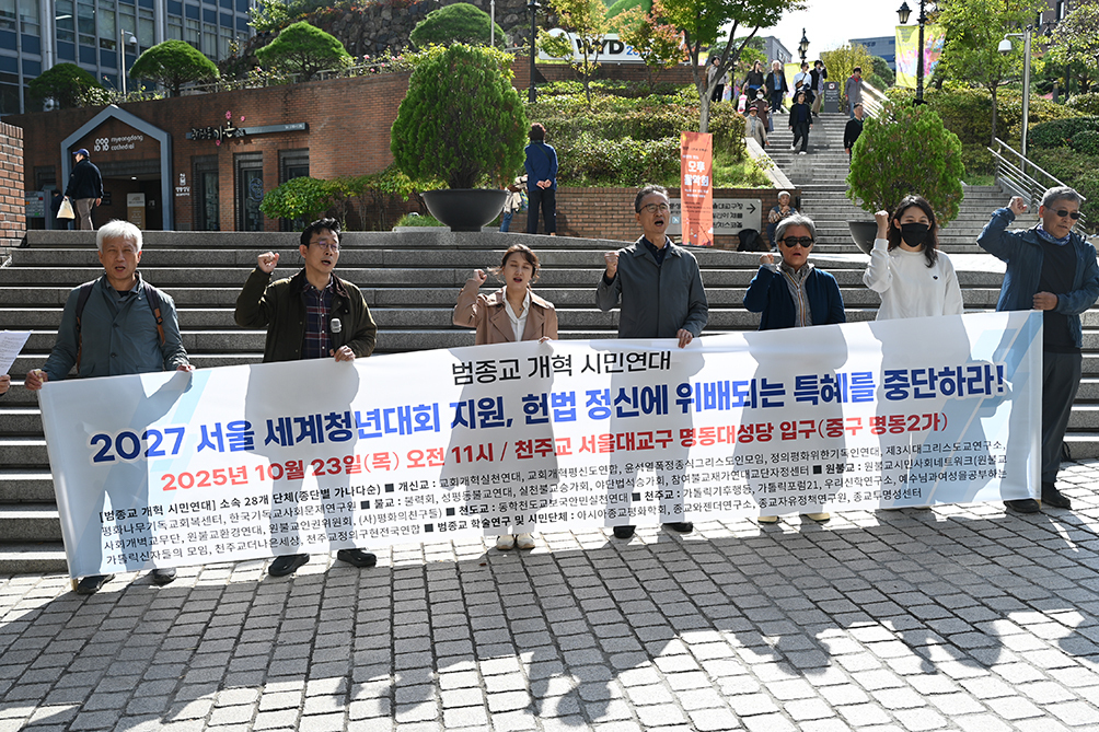 범종교개혁시민연대가 10월 23일 서울대교구 주교좌 명동대성당 앞에서 2027 서울 세계청년대회(WYD) 특별법 제정 반대 구호를 외치고 있다.범종교개혁시민연대(범종교연대)는 10월 23일 서울 주교좌 명동대성당 앞에서 ‘서울 WYD 지원 헌법 정신에 ...