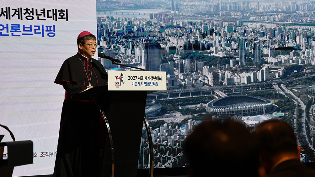 2027 서울 세계청년대회(WYD) 지역조직위원회 위원장 정순택(서울대교구장) 대주교가 10월 27일 가톨릭대 성의교정 옴니버스파크에서 열린 ‘2027 서울 WYD 기본계획 언론브리핑’에서 모두 발언을 하고 있다. 정 대주교는 이 자리에서 ...