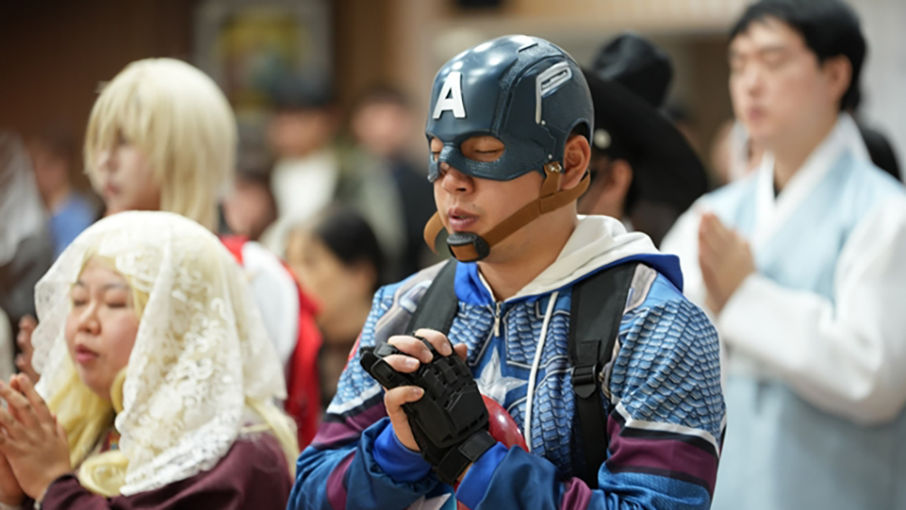 ‘홀리스타 페스티벌’에 캡틴아메리카로 분장한 참가자가 기도를 하고 있다.(WYD수원교구대회조직위 제공)한복을 입은 순교 복자들, 짧은 콧수염 위로 결연한 눈빛의 안중근(토마스) 의사, 영화 속에 등장하는 영웅까지. 이들의 모습으로 분장한 젊은...