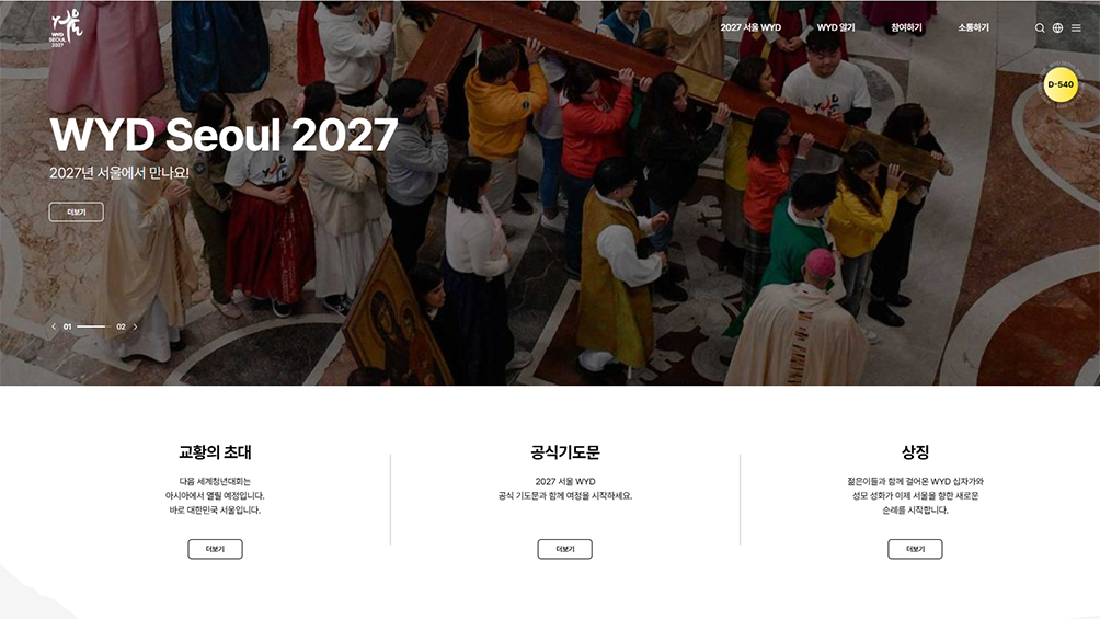 2027 서울 세계청년대회 공식 홈페이지가 6개 공식 언어(한국어·영어·스페인어·프랑스어·포르투갈어·이탈리아어)로 새 단장됐다.2027 서울 세계청년대회(WYD) 조직위원회는 전 세계 젊은이와 관계자들...