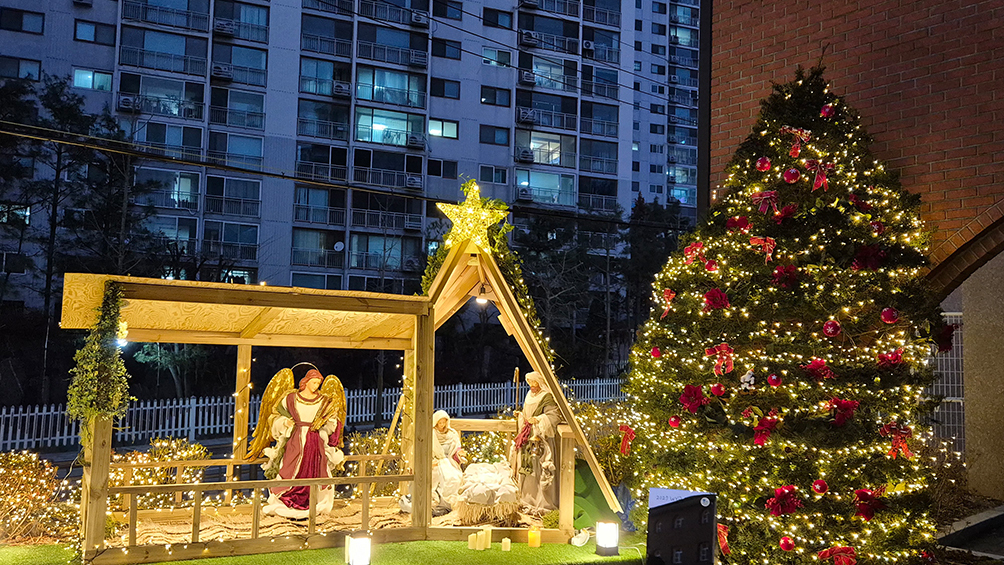 2027 서울WYD 수원교구대회조직위원회가 설치한 성탄 맞이 구유. 성모님과 요셉 성인, 천사가 예수님 탄생을 기다리고 있다. (수원교구대회조직위 제공) 2027 서울 세계청년대회 수원 교구대회 조직위원회는 11월 30일 가톨릭교육문화회관(경...